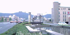 五条大橋西詰めにある義経と弁慶のモニュメント。 左側が義経(欄干に乗っている)。 河原町側にベンチなどがおかれているが、このモニュメントには近づけない。